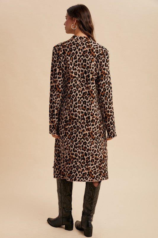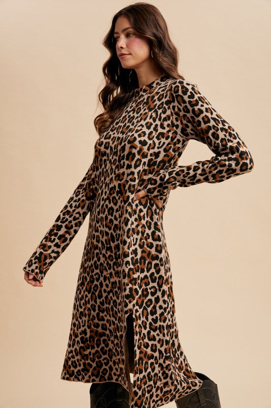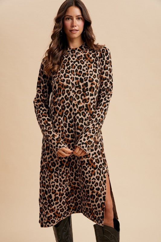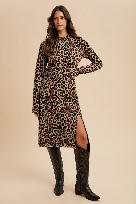 LEOPARD MOCK NECK FRONT SLIT MIDI DRESS