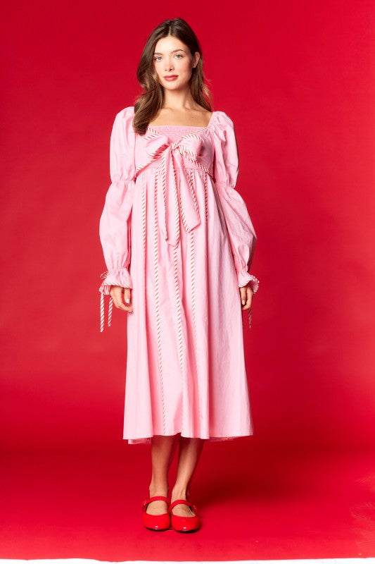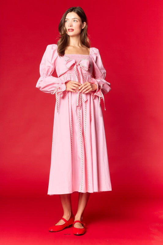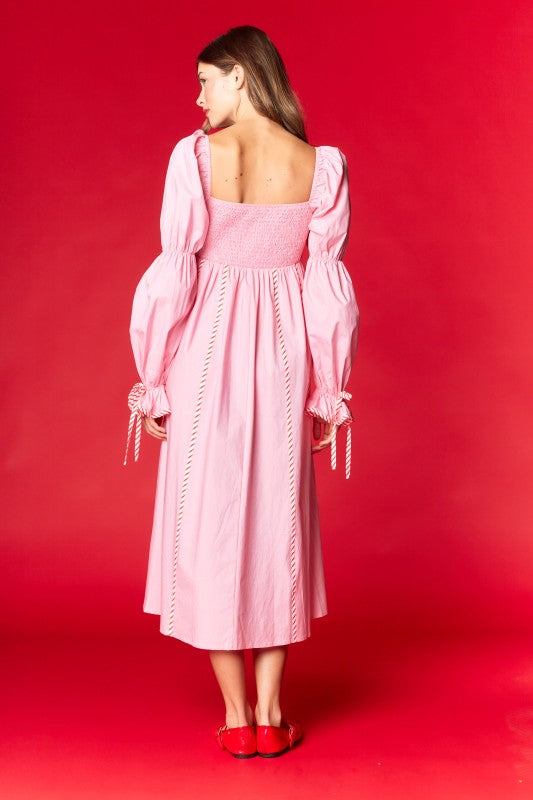 - Long puff sleeves with ribbon-tie cuffs