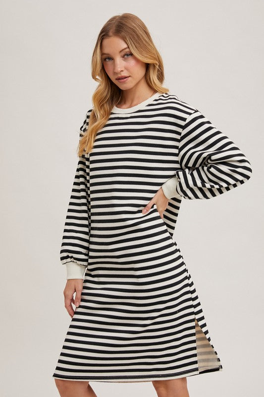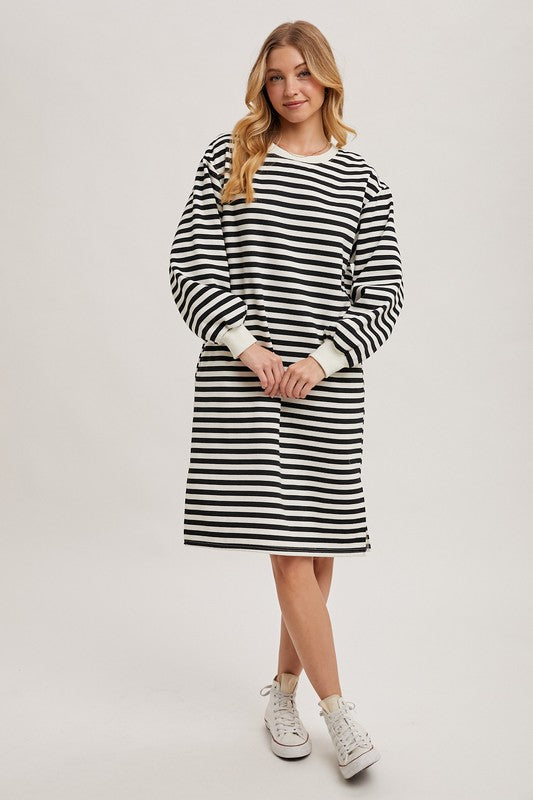 Striped French terry midi dress with pockets. This comfortable and chic dress features a classic striped pattern and convenient side pockets. Made from soft French terry fabric, it offers a cozy feel and a flattering midi length. Perfect for casual outings or lounging at home, this versatile dress can be easily dressed up or down. The relaxed fit ensures all-day comfort while maintaining a stylish look.